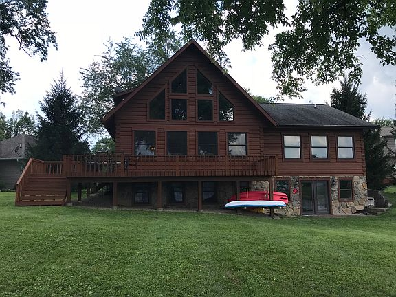 REDUCED!! Home is offered FULLY FURNISHED and below Z-Estimate!!! You won't find a more turn-key waterfront home with breath-taking views on Lake Lorelei. Gorgeous log home with fantastic views of Lake Lorelei on the main water, just at the end of the lake. 116' of shoreline! Newer dock with two boat slips and one hydrolic lift, along with two jet ski ports with lifts. Home has many new improvements including updated siding and roof flashing, brand new concrete driveway & sidewalk, hydrolic boat lift and the entire shoreline has been relined with rip rap. House is offered fully furnished. 1608 of the 1725 in the basement is finished and includes a bedroom, full bath, laundry, family room with entertainment area (ping pong, excercise facility, air hockey, etc.) and wet bar. Unfinished storage is about 117 sf.