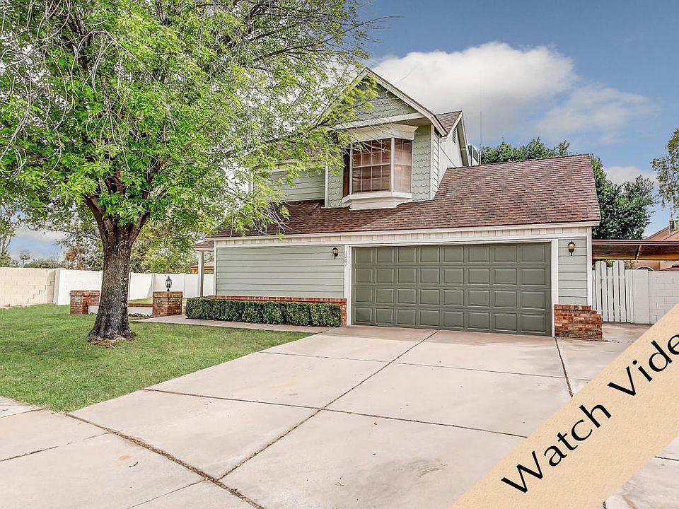 Beautiful home, located on a large pie-shaped lot in Chandler. NO HOA!! Picturesque front lawn with mature tree. Vaulted ceilings with skylight in the formal living and dining room, along with wood floors and tons of natural light. Open-concept main living area with cozy fireplace. Eat-in kitchen offers tons of cabinets and a breakfast bar. Inside laundry, full bathroom, and bedroom downstairs. Split floor plan upstairs. Large master bedroom leads to the full master bath with double sinks and separate seated vanity. Down the hall, 2 more bedrooms and a full bathroom. Backyard showcases a sprawling lawn, glistening pool, and travertine deck with beautiful ramada. Wide sideyard with covered patio. Large home on a large lot. This home is a must see!