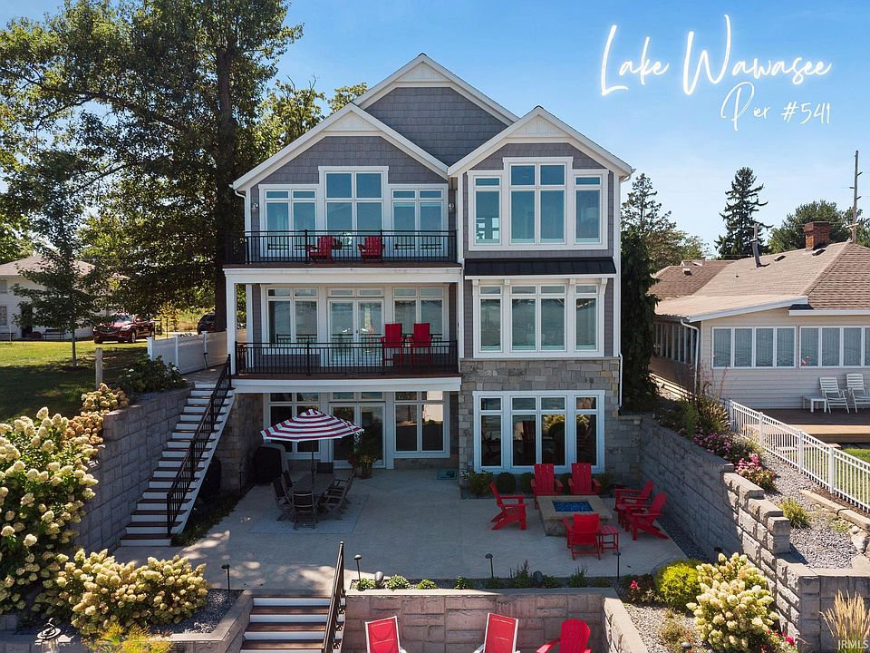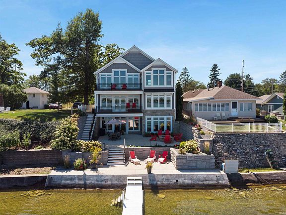 Enjoy Lake Life! Escape to your very own slice of paradise on Lake Wawasee! Located on the desirable Ideal Beach w/50' of frontage & sandy lake bottom, Pier #541 offers unparalleled waterfront living. This alluring home, built in 2015, is perfect for entertaining family & friends w/its 4 bedrooms and 3.5 baths. Professionally designed w/high-end finishes, the spacious, open-concept layout features 10’ ceilings, Sub-Zero & Wolf appliances, & modern kitchen amenities. Furniture & furnishings are negotiable! Luxurious touches like beautiful wood flooring & abundant Marvin windows trimmed in white create a fresh, clean, & effortlessly chic atmosphere w/almost every room having a lake view. The attractive exterior is low maintenance w/professional landscaping & timed drip lines, white vinyl privacy fence, 2 patios, large tiered deck, vinyl siding contrasted w/white trim, complemented by an oversized cement driveway for ample parking. The main level 2-story living area boasts fantastic waterfront views from a wall of windows & French doors that open to a walk-out patio. A huge granite fireplace is the star of the living room. The chef’s delight kitchen is on-trend w/SS appliances, a tile backsplash, abundant cabinetry, granite counters, large island w/seating & built in desk/office area. Adjacent to kitchen, a formal dining area is perfect for dinner parties or family meals. Add'l main floor features include walk-in pantry w/coffee bar, laundry room, & stylish 1/2 bath. Upstairs, a gorgeous glass railing leads to landing area w/mesmerizing lake views. Primary bedroom features private patio, wall of windows, large walk in closet, & ensuite bath w/dual sink vanity, glass walk-in shower, freestanding tub, & private commode. Two more bedrooms share a full bath w/dual vanity sink, & another laundry room & ample storage throughout the upper level. The beautiful walk-out lower level offers a large family room w/fabulous lake views & full wet bar w/granite counters & ample seating. This level also includes another bedroom, full bathroom, & additional storage. Relax on the pier or patio w/the gas firepit & enjoy serene water views. Other features include Smart home (Control 4 – sound, alarm, HVAC, security), whole-home generator, 2 HVAC systems w/3 zones, custom room-darkening built-in shades. Located minutes from restaurants, town & Syracuse Wawasee Trail. What are you waiting for?
