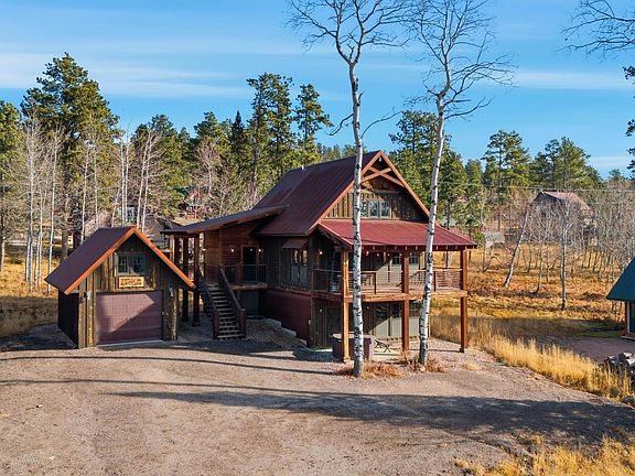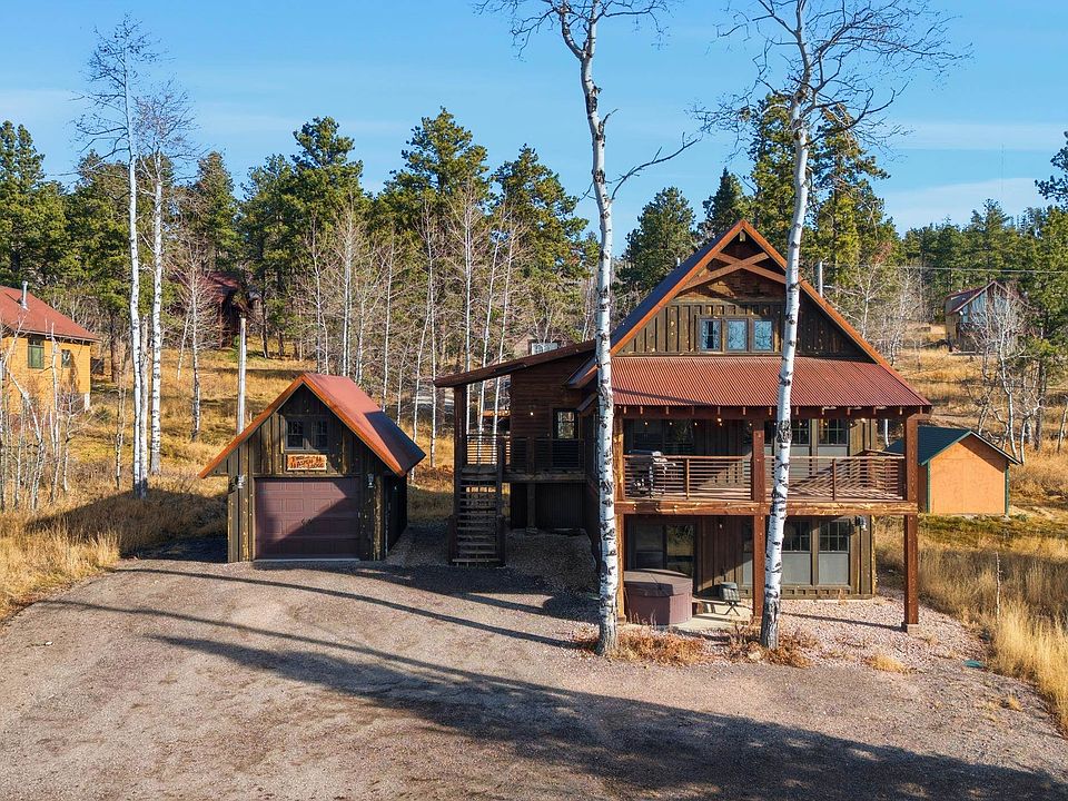 Discover the ultimate Terry Peak retreat — Twin Aspen Lodge, a beautifully crafted rustic cabin with elevated finishes, stunning views, and unbeatable proximity to the slopes. This turnkey Black Hills getaway features a spacious open-concept layout, soaring high ceilings, rich dark wood floors, and live-edge granite countertops that bring luxury and character to every room. Designed for comfort and functionality, the main level offers a cozy primary bedroom, while the walkout basement features two additional bedrooms complete with custom built-in bunk beds, maximizing sleeping capacity for guests, family, or nightly rental income. Massive windows throughout the home showcase the surrounding pines and hillside scenery, flooding the space with natural light. Step outside to enjoy covered decks framed with rustic timber and raw-steel accents, perfectly paired with the beautiful corrugated metal roof for a timeless, mountain-modern aesthetic. A detached garage provides ideal storage for skis, ATVs, bikes, and all your Black Hills adventure gear. Located just minutes from Terry Peak Ski Area, this cabin is the perfect basecamp for Black Hills powder days, hiking, snowmobiling, and year-round outdoor exploration. Whether you’re seeking a weekend escape, a full-time retreat, or a vacation rental investment, this property checks every box. Experience the magic of Black Hills living—your Terry Peak cabin awaits.