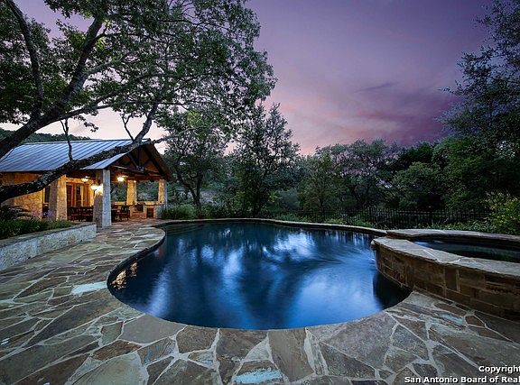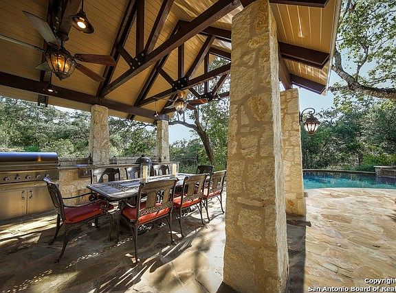 Inspired Hill Country Living*Gorgeous updated to perfection home includes dream entertainment facilities*Views & Privacy*Poolside Pavilion w/world class Indoor-Outdoor Kitchens plus bath*Multiple covered patios and decks to enjoy the outdoors*Handsome wood beams*Huge master suite w/sitting room & marble fireplace*Manicured but lush landscape is beyond belief*No Carpet*Kitchen could host a cooking show*Los Reyes Canyons is lovely gated community 10 min north of 1604