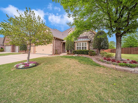 Beautiful and loaded with extras. Bixby schools, New Roof 4/23 U.L.class 4 impact resistant. Newer kitchen appliances, main bedroom, and guest bedroom downstairs, and two living rooms on the main floor. Hardwood floors, freshly painted in some areas of the home. Pre-wired for surround sound on the patio and family room. Central vac, two fireplaces, Sprinkler system front & back yard. Lighting and outlets were added in the garage. Safe room inside laundry room, All newer gutters and downspouts replaced 2011, exterior painted 2021, recessed lighting and outlets added upstairs, HVAC system replaced 2012 both units. Cleaned HVAC ducts and new Kohler Cimarron toilets. Replaced water heater in 2019. New garage doors and openers 2021.