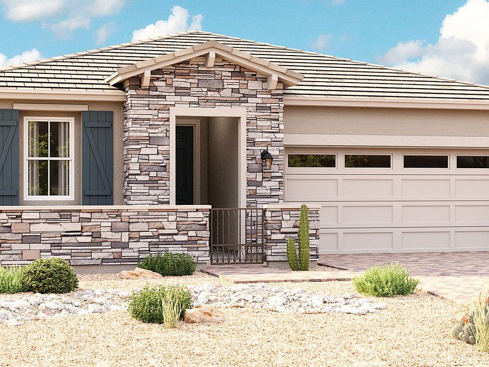Explore this thoughtfully designed Slate floorplan, ready for quick move-in on a homesite boasting front yard landscaping, a stone covered patio, and driveway/walkway/patio pavers. Included features: an inviting covered entry; an eat in dining room, a well-appointed kitchen offering 42'' white shaker cabinets with satin nickel hardware, quartz countertops, 3x6 subway tile backsplash, stainless-steel appliances, a center island with pendant light pre-wire, and a spacious walk-in pantry; an expansive great room; a lavish primary suite showcasing a generous walk-in closet and a private deluxe owner's bath with separate tub and shower, and dual sinks with cultured marble countertops; a convenient central laundry; a guest bedroom featuring en-suite bathroom, a covered patio, and a 2-car garage with 8' door and belt drove opener. Find other desirable finishes, like 7x22 tile in the main living areas, two tone paint, a convenient soft water loop in the garage, tankless gas hot water heater, and a gas stub at the patio. This home also offers additional windows in the great room and owner's bedroom, as well as ceiling fan prewire in all bedrooms, great room, and patio.