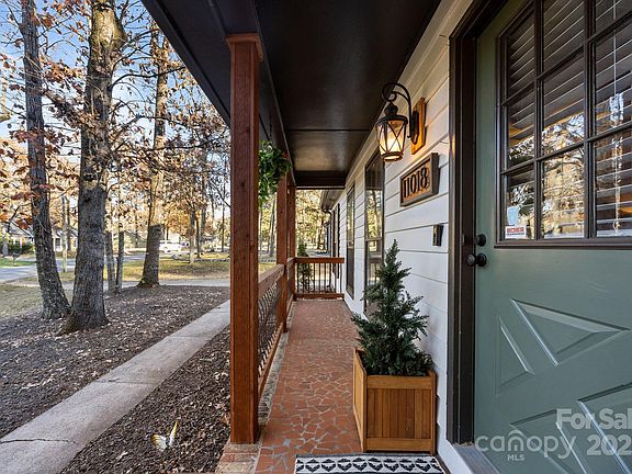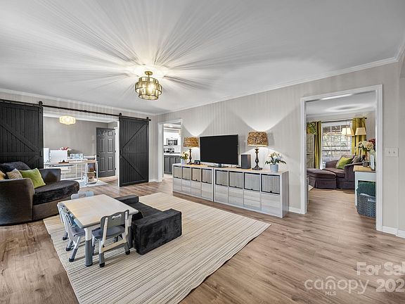 Nestled on a sprawling lot in Charlotte, NC, this stunning ranch home seamlessly blends Southern comfort with modern design. Beautifully updated throughout, this home is stunning. The formal living room features vinyl plank flooring, neutral paint and room for multiple seating areas. This room opens to both the great room and the formal dining room, which is currently being used as a home office. The great room features a wood-burning fireplace and flows seamlessly into the kitchen. This area is ideal for entertaining family and friends, or enjoying a cozy evening at home. The kitchen is sure to please the chef of the home ~ Stainless appliances, white cabinets, tile backsplash, solid surface counters, recessed lights, wine refrigerator, pendant lighting, oversized island with breakfast bar and a wood ceiling. The primary bedroom suite is a work of art, featuring a wood ceiling, Board and Batten accent wall and beautifully renovated primary bathroom with tiled shower, new vanity, lights, and tile floors. The primary suite also has a walk-in closet. The secondary bedrooms are spacious with good closet space. The secondary full bathroom has also been remodeled with stunning finishes. Venture outside to discover an outdoor oasis. The huge deck features multiple seating areas, a dining area, an area for grilling and for those evenings when you just want to relax and pamper yourself, a deep seated hot tub. But that is not all! A truly unique and impressive addition to the back yard is the renovated shipping container, providing an additional @ 320 square feet of space. This cleverly designed container has electric and has been transformed into two spaces. One side features huge windows and French doors, flooding this area with natural light. The other side has a garage door and a single door, with plenty of space for your projects. Use your imagination and create a space all your own ~ an office, art studio, workshop, garden space etc. This unique feature adds unparalleled value and character to the property. The huge yard has two additional storage buildings, a play set, a fire pit area and space leftover for outdoor activities.