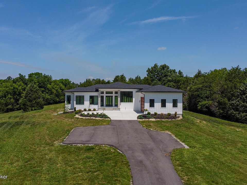 LUXURIOUS MODERN 4 bed/3.5 bath home with WALKOUT basement located on a private 10-acre lot (adjoining 16.5 acres also available)! This is a new construction home by David Weis at Meridian Construction featuring many high-end, eco-friendly finishes and an open floor plan with has hardwood flooring, tall ceilings, and an abundance of natural light through large Windsor windows. The kitchen includes tall, custom Barber cabinets, quartz counters, stainless steel appliances, a large island w/ breakfast bar & a huge pantry. 12-ft great room has a built-in bookcase & entertainment center, recessed lighting & opens to the back patio. Spacious primary bedroom suite has a large, custom organized walk-in closet & an ensuite bath with dual sink vanity w/quartz countertop, subway tile, a walk-in shower & separate tub. Main level also includes 2 additional bedrooms, another full bath with dual sink vanity & tub/shower combo located conveniently between 2 of the bedrooms, an office (or possible 5th bedroom), a half bath and a large laundry/mud room conveniently located off the garage. The partially finished walkout basement has a large family room, another office which opens to the side patio, another bedroom, a 2nd office & another full bath conveniently located next to the bedroom. The basement also has large egress windows on one side of the house and an abundance of storage area. Backyard is level and includes a covered patio off the great room and an insulated metal Amish-built 12x24 shed with LVP flooring. There is an attached 2.5 car garage with 10 ft tall cedar look garage door with windows and a large parking pad/driveway. Home is very private with mature cedar, hickory and near record-breaking size oak trees scattered throughout the property. Home also has NO VOC paints, a futuristic UV direct discharge septic system which lets out clean water back into the environment and is in a great location close to Turkey Run Park, the Brown-Forman Silo Center, the Silo Center Bike Park and the Cliffside Playground & Sprayground. Enjoy freedom & quiet in this incredibly built & beautifully designed home which is away from the burden of HOAs and houses stacked on top of each other! Schedule your personal showing today!