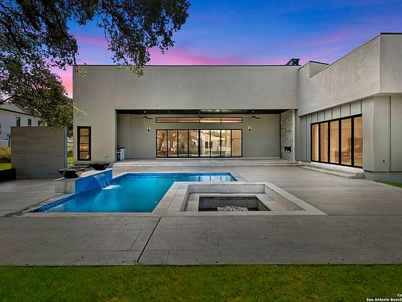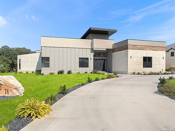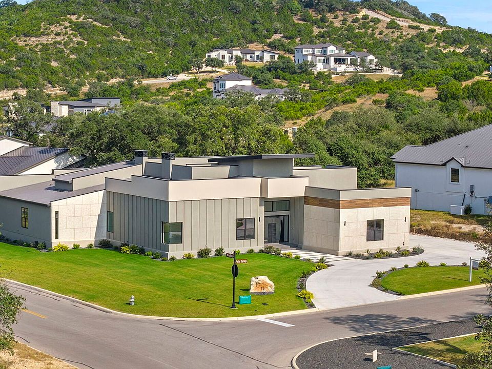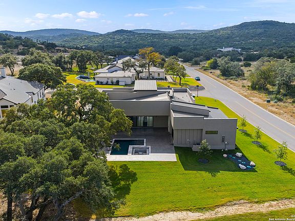 A statement of modern architecture and refined Hill Country living, this custom single-story residence in The Canyons at Scenic Loop is constructed with 2x6 exterior framing, enhanced insulation, and single-slope standing seam metal roofing for superior efficiency, longevity, and clean contemporary lines. Offering 3,719 sq. ft. of intentional design, the home features gallery-height ceilings, expansive walls of glass, and seamless indoor-outdoor connection. The open living space is anchored by a striking feature wall with a linear fireplace, flowing into a chef's kitchen with European-inspired cabinetry, a waterfall black granite island, 48" professional gas range with pot-filler, double ovens, and a hidden walk-in pantry. The owner's retreat evokes a spa-like sanctuary with a sculptural soaking tub, oversized glass shower, and warm natural textures. Outdoor living becomes an everyday experience with a resort-style pool and elevated spa framed by water and fire features, covered lounge terrace with fireplace, outdoor kitchen, and poolside shower beneath heritage oaks-where minimalist design and luxury craftsmanship meet at the highest level.