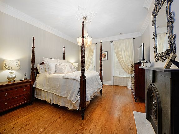 Fabulous 4 story Brownstone on coveted uptown block. This family-friendly home was totally renovated including all new plumbing systems, 200 AMP electrical system, 2 zone heating and cooling with air purification. Special attention to period details which include original parquet floors on parlor level, crown molding & hardwood floors throughout. Solid wood doors with new Baldwin hardware. Marvin Windows, 5 fireplace mantles, 2 on the parlor floor have new SS vented Chimney and gas line, ready for log set. 1st floor includes open floor plan with dining room, sitting room, powder room and custom cherry kitchen complete with island. SS 6 burner dual fuel Thermador range, Monogram SS Refrigerator and side-by-side Fisher Paykel DW's. Double doors lead out to a Hufnagel designed private yard with slate patio, Synlawn and custom pergola- all complete with irrigation, lighting and gas line for your grill. Parlor floor consists of beautiful bright living room and double door archway leading into custom wood paneled library/family room. 3rd Floor master suite with walk in closet and 2nd bedroom. 4th floor has 2 large bedrooms and shared Jack and Jill bath. Monthly parking available 3 blocks away at 12th and Hudson St.
