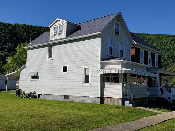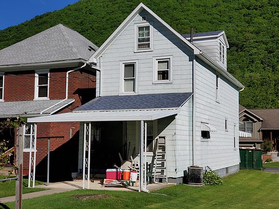 Traditional Style home in Renovo, PA come take a look at this fixer that features 3 bedrooms and 1 bathroom, front enclosed porch and cover back porch with patio, basement for systems and storage, separate car port, nice level with shed for added storage.