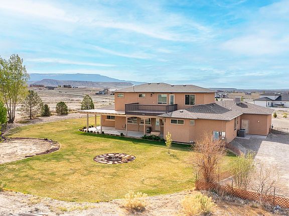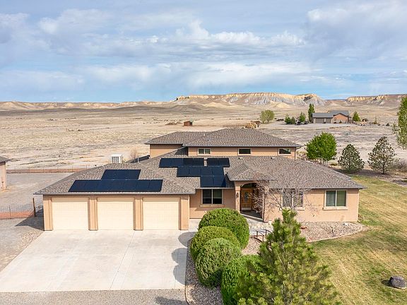 Wow! This kind of property does not come along very often! There are 8 acres with plenty of views and privacy with access to public lands for hiking, biking, horseback riding, and four-wheeling. This home includes 4 bedrooms, an office/music room, 3 bathrooms plus a 1/2 bath in the 3 car attached garage. In addition, there is a large detached shop with RV parking and hookups. The kitchen is amazing and equipped with a gas range/oven, built in oven and microwave, trash compactor, lovely pot rack, gorgeous granite countertops, large pantry, and an informal eating area. there is a large formal dining room, a great room with soaring 20 ft wood ceilings, kiva gas fireplace, entertainement center with large screen TV, oversized Alder wood doors throughout, hardwood and tile flooring, and lots of view windows. The loft area is complete with a wet bar, refrigerator, a guest bedroom, and a 3/4 bathroom. The energy efficient solar panels are owned, and there is central A/C, and tankless water heater. Enjoy summers on the lovely covered patio with misters and gas spigot for BBQs. There is irrigation water through the HOA for landscaped areas. Beautiful country setting, yet only 15 minutes from downtown Grand Junction and the City Market.