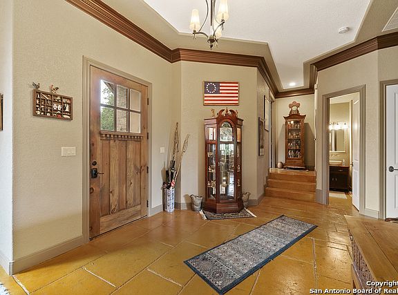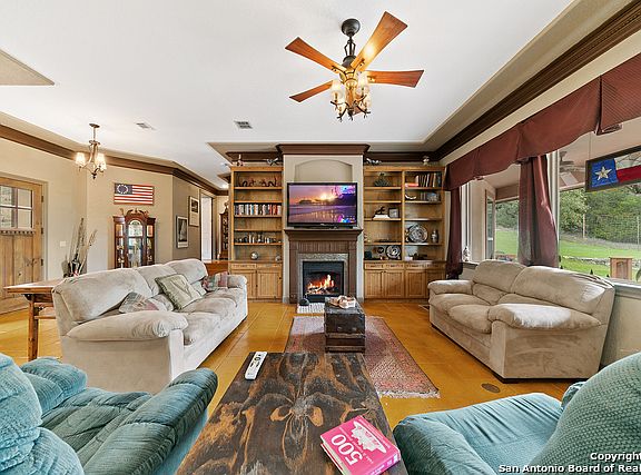 Beautiful custom built home with 2 islands & ovens, granite counter tops, large laundry & walk in pantry, custom cabinetry. Home has custom crown molding, cool stone & wood fireplace, raised study & an elevator shaft ready for an elevator (currently closed in & used as closets. 30 mile view, high efficiency AC system, SS appl, Metal roof, beautiful landscape with pond, large basement with extra room for crafts or exercise. Large doorways & space throughout the home