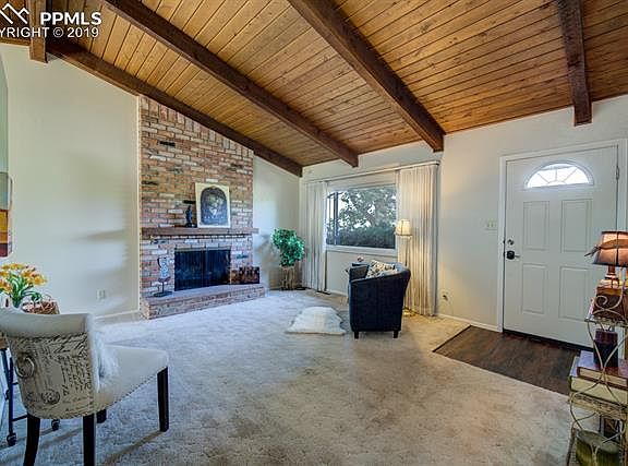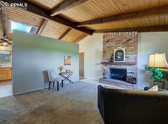 Westside beauty with 5 bedrooms 3 baths and oversized 2 car garage. Ranch home with 3 bedrooms on main level, each with beautiful wood floors! Living room has views of Pikes Peak and has gorgeous planked vaulted ceilings and a cozy wood burning fireplace. The updated kitchen has corian countertops with an integrated sink. The eat-in kitchen walks out to a stamped concrete patio and lavish backyard with small green house and gazebo. Basement features 2 additional bedrooms, large family room with FP, 3/4 bath & laundry.