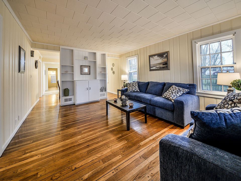 Darling 3 bedroom, 1 bath frame home on a corner with 2 car garage with new electric garage door opener and fenced back yard. This newly updated house has a newer a/c unit for efficiency, roof and gutters. Inside the eat-in kitchen has a new dishwasher plus a refrigerator and range. There is nice cabinet with lots of work space and an island with smack bar attached. The hardwood floor with wood pegs are rare and beautiful! Refrigerator, stove and dishwasher
