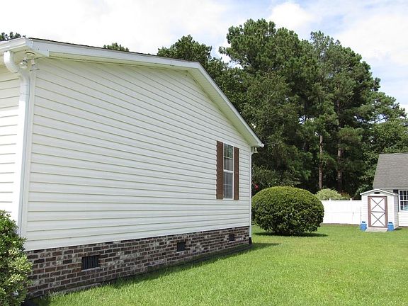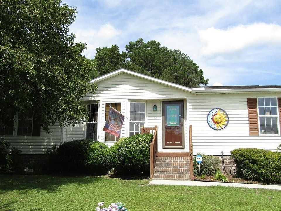 Carolina Shores - 3 BR 2 BA manufactured home in the Village at Calabash. Charming home with pretty wood tone Laminate floors in living room. Kitchen and dining area have LVP flooring and are to the rear of the home with a view of nicely landscaped back yard & privacy bushes. The cute little deck off the slider is the perfect place to relax. There is also a handy shed out back. The living areas have an open cathedral ceiling and the master bedroom has a vaulted ceiling. A split bedroom plan puts the guest area to the right with a bath between two bedrooms. The master bedroom is to the left with a large en-suite bath and ample walk-in closet. All appliances convey. The appliances, (except the dryer), are three years old and under a 5 year warranty from Home Depot. A termite bond is good until 2025. Gutter guards on front gutters. The Village at Calabash is just minutes to the Town of Calabash, several beaches as well as Little River, North Myrtle and Myrtle Beach, SC. The community has a clubhouse and pool and offers lots of opportunities for social and community activities. Take a look today. Priced to sell!!!