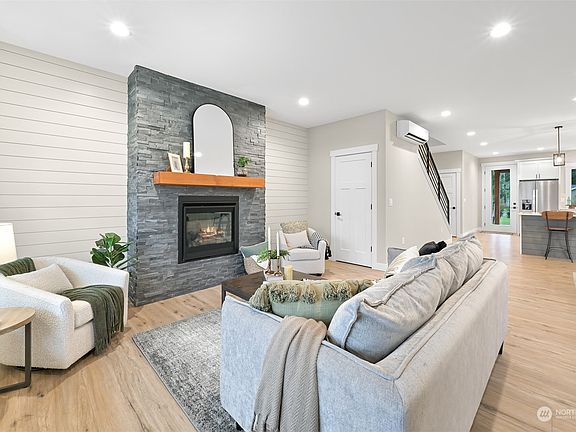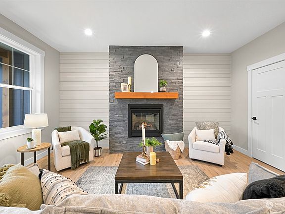 This stunning 4-bedroom, 3-bath home showcases modern finishes, convenient main-level living and a cozy gas fireplace. The open floor plan features a sleek, modern kitchen with quartz countertops, a tiled backsplash, stainless steel appliances, and ample storage, seamlessly flowing into the dining and living areas. The main-floor master suite offers a large walk-in closet and a spa-inspired bathroom with a tiled shower and double vanity. Two additional bedrooms, a full bath, and a laundry room complete the main level. Upstairs is a large bonus room, full bath, plus an additional bedroom. Outside, the spacious covered patio is perfect for entertaining or relaxing!