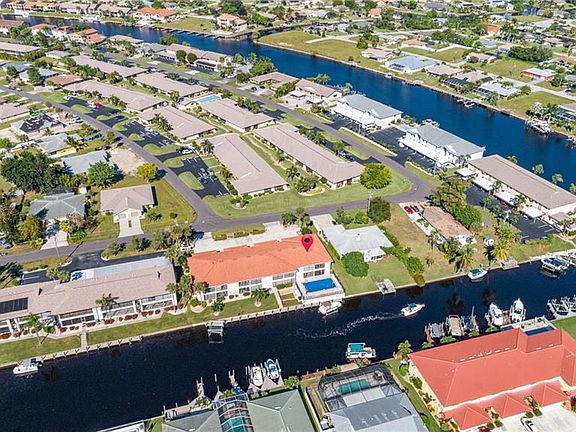 Spacious, fully furnished gulf access townhome with deeded dock space. Tile floors throughout the main living area. White cabinetry in kitchen, hard surface countertops with large peninsula with room for plenty of bar stools The main living areas are freshly painted. Eat in kitchen. Open concept floor plan is perfect for entertaining. Large bedrooms with en suite baths. Custom cabinetry in all baths and gorgeous tile work in the walk in showers. Main level opens to screened lanai with views of the sparkling pool and water. Deep canal with a quick ride to the Caloosahatchee River. One car attached garage, hurricane shutters included, and community pool for your enjoyment.