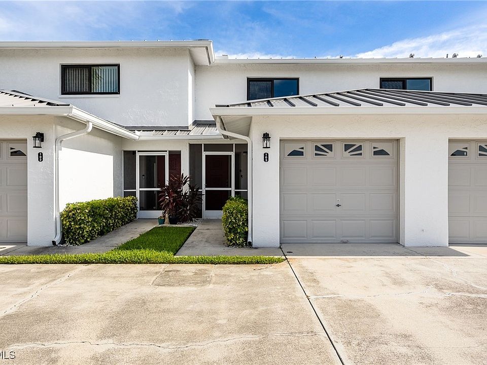 Welcome to your slice of paradise! This beautifully-decorated waterfront townhouse features two master suites, a half bathroom downstairs and an attached garage — a rare perk in this area. The entire complex is freshly painted with a brand new metal roof and gutters installed in 2024. This unit also features electric roll-down aluminum hurricane shutters for peace of mind. Tucked away in a quiet neighborhood off Country Club Blvd., this prime location is convenient to both the Veterans Bridge and Cape Coral Bridge and, by boat, it's only a 15-minute ride to the river! Add your own boat slip and lift — with HOA approval — or just enjoy fishing off the community dock. Catch sunrise and sunset from your south-facing lanais both upstairs and downstairs. Enjoy entertaining family and friends in your open kitchen and spacious living area. This is an ideal spot for a full-time residence or a seasonal retreat!