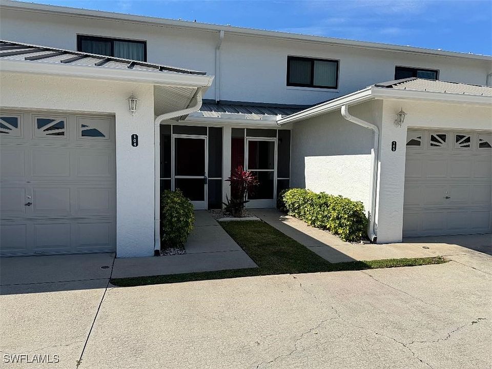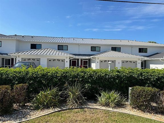 Gulf access townhouse living at it's finest. 2 bed, 2.5 bath with attached one car garage. Fresh exterior paint, new metal roof, downspouts and gutters in 2024. 1st floor lanai is just a few steps away from the pool area. Water heater was install in 2020. Water lines were re-piped. The first floor offers an updated kitchen with granite tops, stainless appliance package, elite white shaker cabinets, Beautiful tiled backsplash and a built in shelf for charging phones. Updated 1/2 bath with marble on elite shaker vanity. 2nd floor boasts two master suites. Updated baths, one features a tub/shower combo, the other a walk in shower. 2nd floor screened balcony has beautiful views of the canal. More than enough storage closets in bedrooms and hallway. Don't forget the large heated community swimming pool. Easy access to both Cape Coral bridges, close to shopping, entertainment, restaurants and the downtown district. Two boat lifts on the property with first come first serve. Call your Realtor today for a private showing.