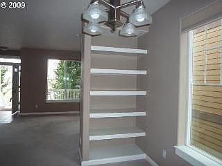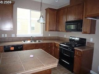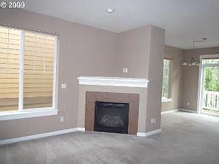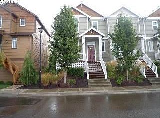 Super cute town home, end unit, front porch, air conditioning. 3 bd/2 baths + lower level finished bonus room. Light & bright, wood laminate floors on main level, gas fireplace. Kitchen has island, gas range, stainless refrig. Built-in shelves in dining area. Vaulted ceilings upstairs. 2-car garage. Great location; 1 blk to MAX line, Costco, Nike. Less than 1/2 mile to Fred Meyer, Starbucks, cafes, parks, pool, and more.
