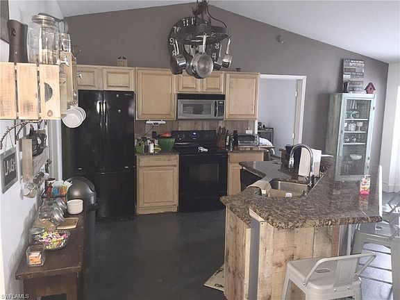 This home features a large open split floor plan with stained concrete floors with a modern eclectic decor. Updated kitchen with large island and granite counter tops. Quiet street and central Cape Coral location close to shopping and easy access to both bridges. Large open yard with plenty of room for a pool.