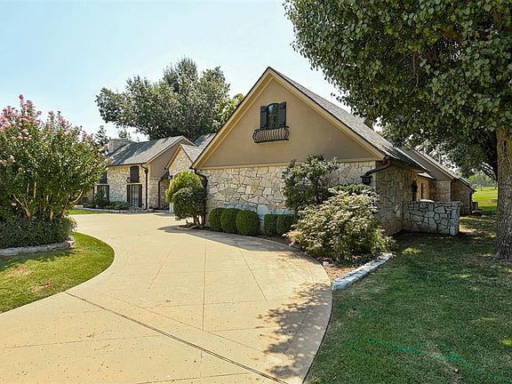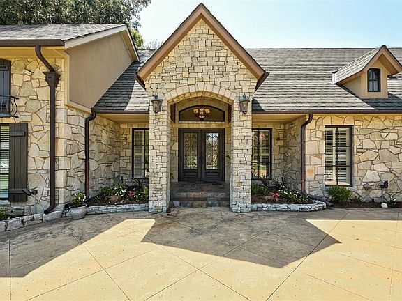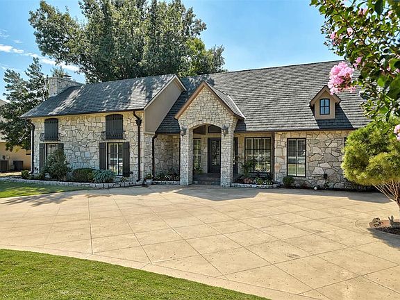This golfer’s paradise in the heart of one of Edmond’s most coveted communities offers the lifestyle you’ve always wanted. Eyes are immediately drawn to the stunning curb appeal of this traditional stone ranch home with an elegantly scored concrete circle drive & steps leading to arched, double-entry iron doors. A foyer with soaring ceilings & herringbone parquet floors opens to a grand living room featuring a fireplace & floor to ceiling windows. A spiral staircase leads to a cozy loft with wall-to-wall shelves, perfect for displaying collectibles or your personal library. Entertaining is effortless with a formal dining room that flows to a massive kitchen with double ovens, custom cabinetry, ample counter space, & large center island with bar seating. The pass-thru window to the patio makes al fresco dining a breeze. Observe nature's beauty from the breakfast table in the morning & unwind after a long day in a cozy sitting area near the kitchen’s stone fireplace. The updated primary suite has new carpet, vaulted ceiling & ambient lighting. The luxurious bath, flooded with natural light, is well-appointed with an oversized jacuzzi tub, separate shower, & two vanity areas. Two closets with built-in drawers & shelving provide plenty of storage for your belongings. Two secondary bedrooms connect to a shared bath, & a powder bath is located near the front of the home for guests. French doors in the living room, kitchen, & primary suite open to covered backyard patios for seamless indoor-outdoor living. Gardeners will delight in landscaping with upgraded irrigation in front & back. The sprawling backyard with mature trees is large enough for a pool & has direct access to Hole #4 of the West Side of Oak Tree Country Club. The over-sized 2-car garage has epoxy floors, built-in workshop area with cabinets, & in-ground storm shelter. A cedar closet in the foyer & stand-up attic provide additional storage. Finally, enjoy peace of mind with 24 hr gate security. Welcome Home!