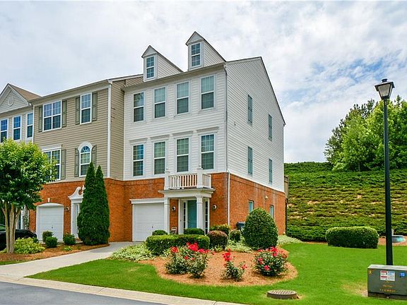 Stunning End Unit in Swim Comm minutes from Avalon!! 3 level townhome w/2 Masters up, each w/own private bath, vaulted ceiling, fresh paint, ceiling fans + huge closets! Main level features wood floors, new wood deck, half bath, Spacious eat-in Kitchen w/SS appls, pantry + tons of counters + wood cabs. View from kit to Fireside Great Rm. Entry level has wood flrs, half bath, Laundry Rm + addtional bedroom/media rm for 2nd living space. Patio is another fresh air space. Massive side yard! 2 pools + minutes from shopping, ent + restaurants in Alpharetta!