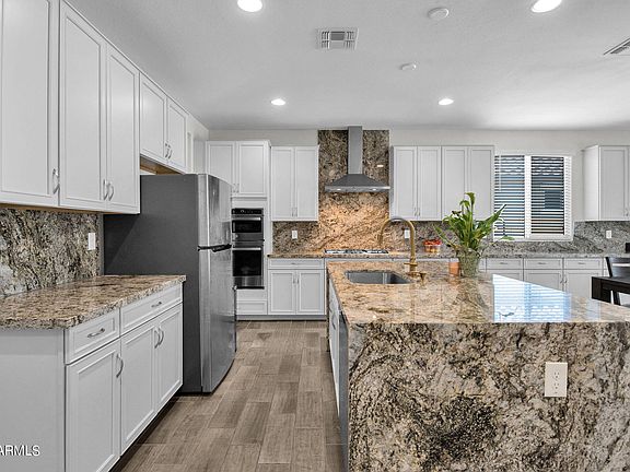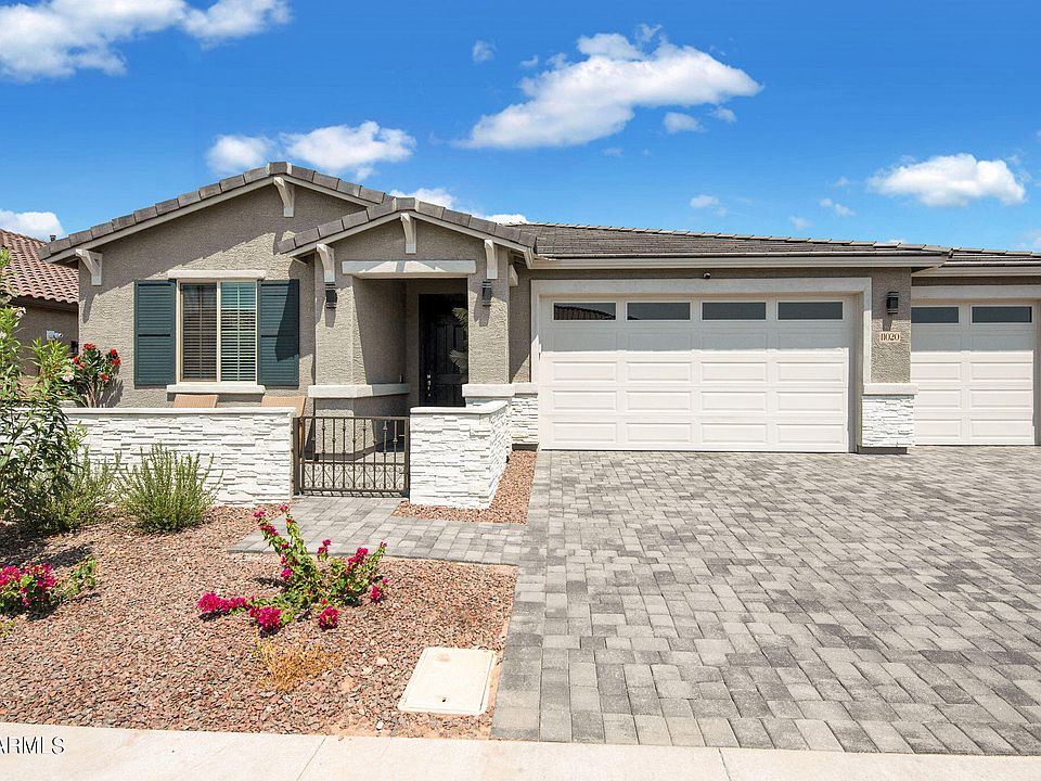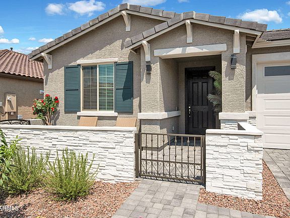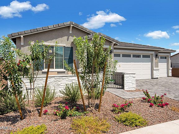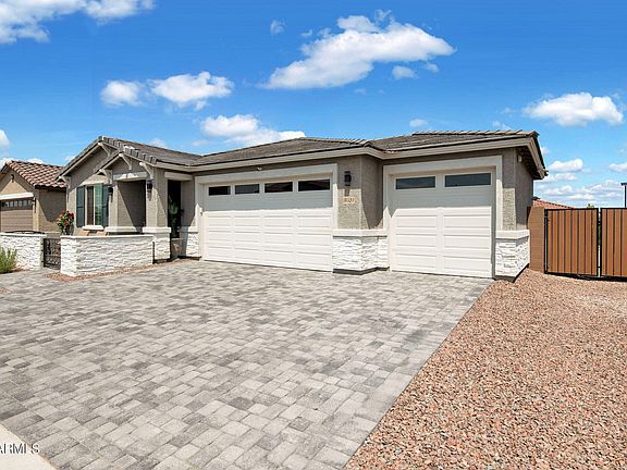 If you are looking for a Brand New Home and have the peace of mind of the builder's warranty but you do not want to deal with a builder's red tape, this is it!! This Stunning Newly Build Home (Built in 2023) is still under the builder's warranty and it already has many upgraded features that you do not have to add to your purchase price value. This features include an inviting covered entry, spacious den/office, a gourmet kitchen boasting 42'' cabinetry , upgraded granite countertops, stainless-steel appliances, wall oven and microwave, a walk-in pantry and a center island. The house has modern tile flooring throughout the high traffic areas. A spacious dinning area and a large great room/family room with center-meet doors leading onto a charming covered patio with tile flooring the master suite is a retreat showcasing a generous size room with a large bathroom featuring dual sinks, large shower, private toilet room and a large walk-in closet; the additional 3 bedrooms come with brand new carpet flooring and ceiling fans. The laundry room is very spacious as well and it counts with a convenient utility sink. When you come in from large 3-car garage with epoxy finish, you walk into the convenience of a mudroom. This home also offers front yard landscaping and driveway pavers. The home also has oversize back yard with rock landscaping (not the traditional beautiful Arizona dirt you get with the builder) and an RV Gate. Come and see it before is gone.