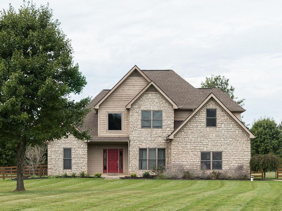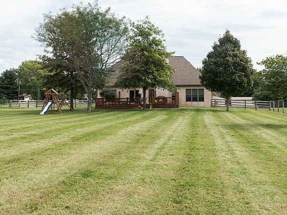 Curb Appeal & open floorplan for your Everyday Getaway on 2 acres! An inviting 2-story foyer leads to the vaulted great room w/stone fireplace! Spacious cook's kitchen w/newer stainless steel appliances including Sub-zero commercial fridge, double ovens, granite counters, plentiful cabinetry & breakfast bar opens to the dining area w/exposed beams overlooking the 2-tier deck & huge fenced backyard! Finished lower level provides nice addl living spaces w/tv/rec/game room, den/office area & full bath! First floor laundry & owner's suite w/hardwood floors, double tray ceiling, whirlpool tub & walk-in tile shower! Sitting rm could be dining rm. All bedrooms have walk in closets! Attic storage plus capped crawlspace provide ample storage areas. Security system. Side-load garage. Custom home!