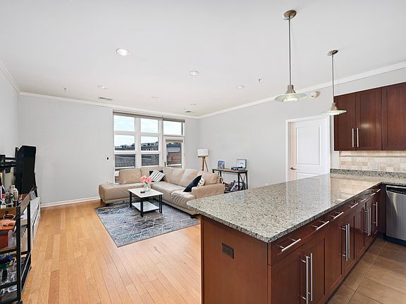 Gorgeous south facing two bedroom in an amenity building with terrace, garage parking and elevator! Modern kitchen boasts stainless steel appliances, granite counters, custom backsplash, gas oven/range, garbage disposal and oversized breakfast bar for plenty of seating and cooking space. Spacious and sunny living room faces south for abundant natural light and is wide enough for a dining area. Relax on the terrace that covers the entire length of the unit! King sized master bedroom features walk in closet with custom shelving and ensuite bathroom with double vanity and glassed-in shower. Central air, in unit washer dryer, and overhead lighting complete the home. This Upper Grand steel and concrete elevator building has sound insulation between floors, with gym, courtyard and garage parking all included and on site. Great location with easy access to the bus to NYC or the ferry. Dolce & Salato, Trader Joe's, Biergarten, and the Northwest Park are just steps away. Available August 1st! Pets are restricted to one dog under 35 lbs or one cat, subject to landlord approval. Please note street address is 1100 Adams St. Bedroom is currently painted navy blue but can be changed to a neutral color if desired. Water/trash/sewer and one parking space included. Tenant pays electricity and gas. Credit check ($40) and 1 month's broker fee applies.
