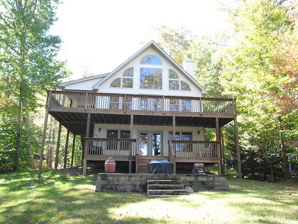 LAKEFRONT! Luxury lakefront contemporary chalet in the gated, amenity-filled community of Arrowhead Lake. 4 bedrooms, 3 baths with fantastic views of the lake. Open concept living, dining, and kitchen area. The living room has hardwood floors, cathedral ceiling, stone-faced wood-burning fireplace and more views of the lake. The kitchen has granite countertops, stainless steel appliances, and custom cabinets. The Master Suite has vaulted ceiling, glass French doors, 2 closets, and views of the lake. Master bath has a jacuzzi tub and shower. Extra features include central A/C, 6-panel doors, 1 car garage, patio with a fire pit and the home is located on community sewer.