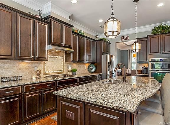 You will fall in love with this stunning 5 bedroom, 4.5 bath, full brick with stone accents home on almost a 1/2 acre lot, located on a quiet cul-de-sac. This award winning floor plan has left nothing off the wish list! Solid hardwood floors, gourmet open kitchen w/5 burner gas stove, tile back splash, SS appliances, upgraded cabinets, granite, walk in pantry & drop zone, sound system in family room and outside patio, gorgeous formal DR, office, guest suite on main, 10 ft ceilings, 8 ft doors, incredible master suite, tiled showers, bonus room w/full bath, massive ground level entertaining area, complete with travertine, fully functional outdoor kitchen, granite and gas fire pit and a 1735 sq ft unfinished walkout basement. BONUS: Home is conveniently located near the subdivision entrance, directly across from the community clubhouse, pool and tennis courts. Minutes from 485. This beauty is turn key! Bring your most discerning clients today ... they will thank you!
