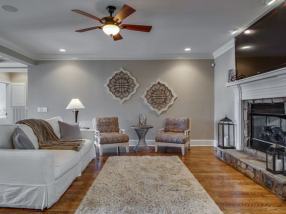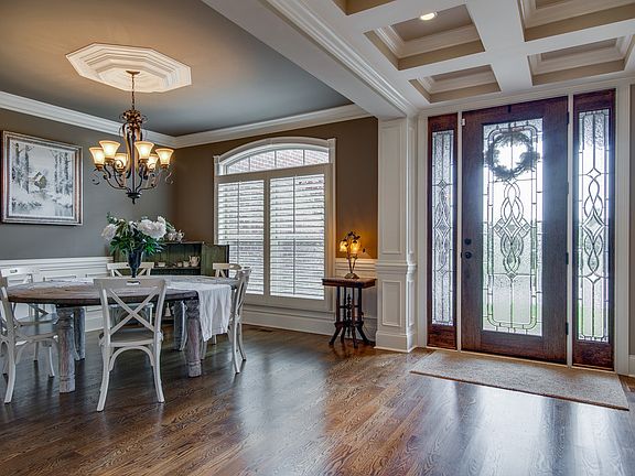 STUNNING, former model home. Hardwoods on the main floor. Large kitchen with SS appliances, granite counters, reverse osmosis system, tiled backsplash. Large owners' suite on main floor, two WIC, bath with whirlpool tub, tiled shower, double vanities w/granite. Dining room opens to living room w/fireplace. Gathering room located off kitchen, sunroom/library shares 2 sided firplace with living room. Spacious bonus on second floor w/half bath. Large covered patio with wood burning fireplace and waterfall. Oversized 3 car garage with epoxy floor. Level yard with beautiful flowering trees and many large, mature trees. Beautiful landscaping, irrigation.