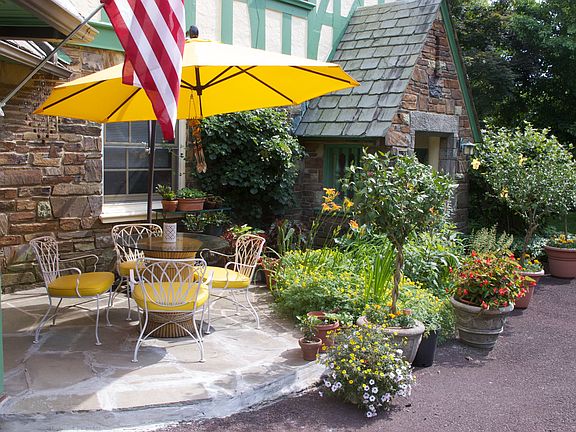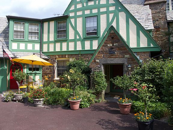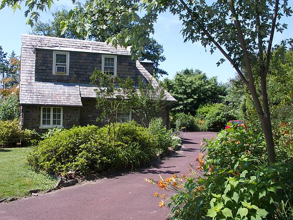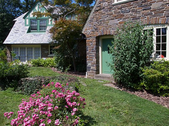 The address of this gracious home is atop a gentle hill on Montgomery Avenue however the driveway and entrance are on the beautiful and peaceful single-block-long Gilpin Road. The home is oriented toward its mature perennial gardens and fenced EP Henry patio with in-ground salt water swimming pool. There is also a slate patio off the kitchen. The home was designed by Main Line Architect Frederick Warner and was built using stone from the Rock Hill Quarry. Warner raised his family in the home and hosted a family wedding here in the large basement in 1947. One of his sons carved the intricate leaves and grapes pattern in the basement beams. The current owners have meticulously updated and maintained the structure and services. Custom true-divided lights have replaced the numerous windows. The Vermont Green slate roof has been regularly maintained and repaired by Miller Roofing. There is a fireplace extant in the living room behind a wall. There are five bedrooms and three bathrooms on the second floor. There are two additional rooms on the third floor and a small cedar enhanced room all used currently for storage. Narberth train station is an easy walk as are restaurants and many other services.