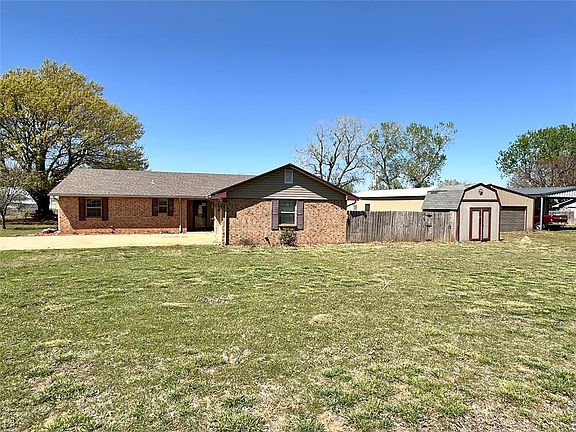 Charming 3-bed, 2-bath brick home nestled on a spacious corner lot just outside the town. Features a convenient two-car attached garage, along with a generous shop and three storage sheds for ample storage activities, and projects. Enjoy outdoor gatherings on the expansive back patio, enclosed within a fenced backyard for added privacy and security. This is a HUD owned property subject