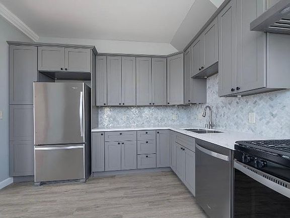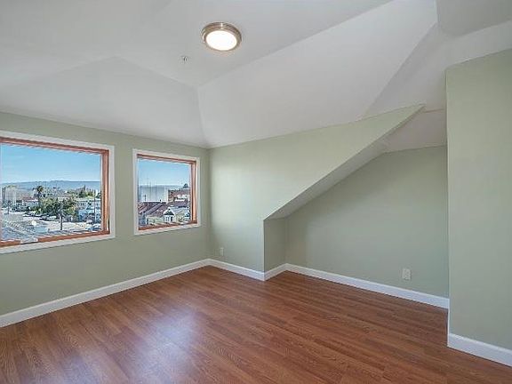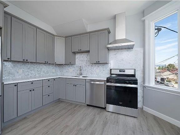 This three bedroom, two bath split level apartment has been completely remodeled, with new plumbing, electrical and sewer lines. It is a brand new interior inside a 20th Century exterior. Views of the Oakland hills can be seen from the north facing bedroom windows, and Alameda beach from the windows to the south side. The kitchen is equipped with brand new stainless steel appliances, and a washer/dryer hookup is located in the upstairs bedroom closet. Indoor parking for one car is included, and the building is only two blocks from Alameda High, and just a block from Park Street. Good credit a must, no pets please. One year lease.
