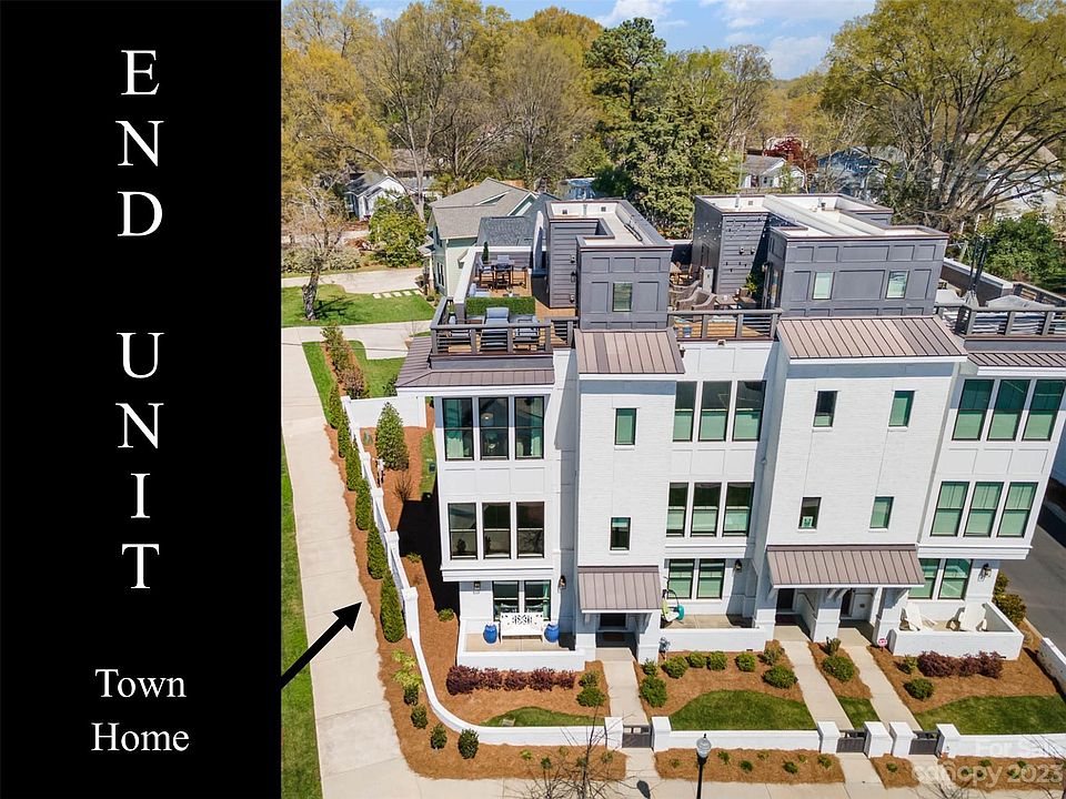 WALKABLE, upscale living opportunity in desirable Myers Park can be yours at an amazing price. Mere steps away from the newly updated Park Road Shopping Center featuring some of the area's favorite dining, bakeries, retail, grocery & gyms. MUST SEE THE VIDEO. This like new, 2019 end unit features a sophisticated, contemporary design with wood & tile floors throughout, quartz counters, and expansive walls of glass. Your PRIVATE rooftop terrace, offers open-air views and a great space for relaxation and entertaining purposes. The fact that the same Builder is building new homes 1 mile away (less walkable) starting at significantly higher prices is a good indication of the value that this home offers. Renovations are under way to convert the building across the street into a Petit Philippe Fine Wine/Tasting Room venue. Seller is offering up to $10K towards your closing costs. This home offers you easy living at its finest. Don't wait, come live the good life today!