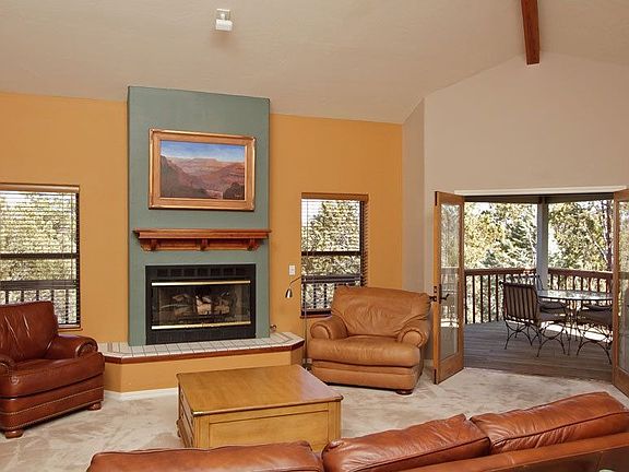 Spectacular pine framed view of mountains are yours from this main level living approximately 2920 square foot home in Timber Ridge. The open great room features high vaulted beamed ceiling with rock hearth fireplace and double French doors onto the deck. The kitchen features an island and eating area. Brazilian hardwood cherry flooring is found in the entry and traffic ways. Set on a low-traffic cul-de-sac, this home offers three roomy bedrooms, two and a half bath, 2-car garage and huge family room making this a great family home. All of the lighting and plumbing fixtures have been updated. A bonus room can either be a hobby room or storage.