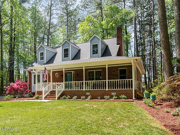Privacy and Convenience! This brick Cape Cod home has 3-bedrooms, 2.5-bathrooms on almost an acre close to downtown Pittsboro. Setback from the road the welcoming front porch perfect for rocking chair views of landscaped areas with azaleas, hydrangea, hostas and other native plants. Within, you'll find an open floor plan and a wood burning fireplace in the living room. With ample room for food prep, the kitchen is bright with granite counters and an attractive peninsula layout. The tranquil main-floor primary bedroom with ensuite bath includes two walk-in closets. Upstairs the other two spacious bedrooms with ample closets ready for styling, large full bath and attic storage. Don't miss this one!