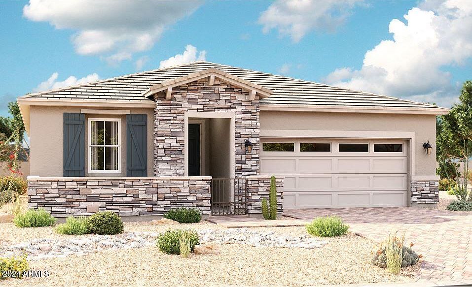 Discover this wonderfully updated Slate floorplan, featuring 4 bedrooms and 3 bathrooms. Highlights: a charming, covered paver entry featuring a courtyard and wrought iron gate, an inviting entry hall, leading to a dining nook, an open great room, and a well-appointed kitchen with 42'' upper cabinets and quartz countertops, 3x6 subway tile backsplash, large walk-in pantry, a lavish primary suite featuring a bonus bathroom entry door, a deluxe owner's bath featuring a large separate soaking tub and shower, a generous walk-in closet, a convenient laundry room, three guest bedrooms (one en-suite), and a covered patio with a gas barbeque connection. You'll also love the front yard landscaping, soft water loop, garage service door, 8' garage door, 7x22 stone tile flooring in select areas, carpet in bedrooms, a bonus window in the primary bedroom, ceiling fan prewire in all rooms plus patio, two tone paint, and concrete pavers in the entry, courtyard, and driveway, and much more!