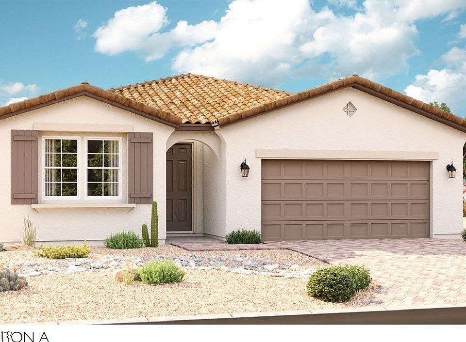 Explore this thoughtfully designed Slate floorplan, ready for quick move-in on a homesite boasting front yard landscaping and driveway/walkway pavers. Included features: an inviting covered entry; an eat in dining room, a well-appointed kitchen offering 42'' white shaker cabinets with matte black hardware, quartz countertops, stainless-steel appliances, a center island with pendant light pre-wire, and a spacious walk-in pantry; an expansive great room; a lavish primary suite showcasing a generous walk-in closet and a private deluxe owner's bath with separate tub and shower, and dual sinks with cultured marble countertops; a convenient laundry; a guest bedroom featuring en-suite bathroom, a covered patio, and a 2-car garage with 8' door. Find other desirable finishes, like 7x22 tile in the main living areas (carpet in bedrooms only), two tone paint, a convenient soft water loop in the garage, tankless hot water heater, and a gas stub at the patio. This home also offers additional windows in the great room and owner's bedroom, as well as ceiling fan prewire in all bedrooms, great room, and patio.