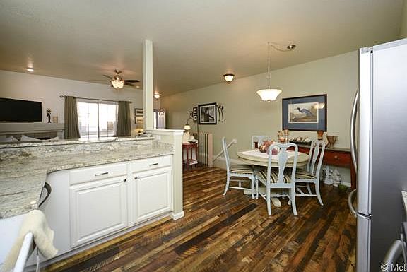 Desirable ranch style townhome floor plan with Condominium HOA designation! An extra bonus is attached oversized TWO car garage included with this floor plan. Breathtaking reclaimed hardwood floors throughout the main living area with elegant living room fireplace and slider door access to the relaxing front patio. Everything has been remodeled to perfection. The kitchen includes a cozy eating space and slab granite countertops that compliment contemporary white painted cabinets and stainless steel appliances. The master bedroom is a beautiful oasis featuring same reclaimed hardwood floors, decorative chandelier and dual closets! Master bath features stunning tile, quartz counter and updated fixtures. A nice sized bedroom and designer 3/4 bath complete the main floor. Resort living at home! The newly carpeted full basement adds over 1,000 square feet of finished space. The massive family room is perfect for entertainment and relaxation! Two well-appointed bedrooms and truly unique full bathroom with oversized soaking tub and designer appointments perfect for family or guests. The laundry room includes a convenient utility sink and storage cabinets. True pride in ownership shows throughout this home. Convenient to schools, parks, shopping, I-25! Niver Canal paved trail is just behind the building, with picturesque Croke Reservoir down the street. Pinnacle Creek... it's not just a neighborhood, it's a lifestyle!