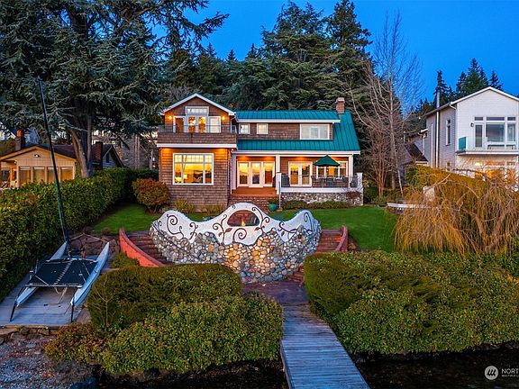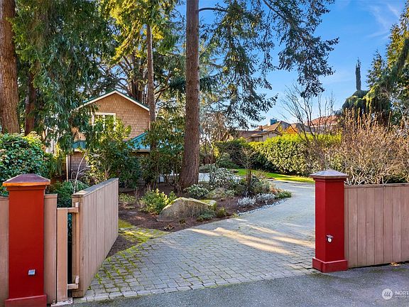 An artistic, one-of-a-kind, waterfront estate, at the very tip of Champagne Point. Through the private entry gate, set on a double lot that measures 1/2 acre, the property proudly boasts lush landscape with a water garden; 3 car garage with separate living quarters; and the main residence with a spectacular staircase tower. The main residence has been extensively renovated over the years, and offers magnificent views of Lake Washington, Mt. Rainier, Seattle Skyline, and Olympic Mountains. On the lakeside, a Gaudi-inspired landmark sculpture offers an artistic transition from the home to the water. 80+ ft of waterfront, 87ft dock with deep moorage, new boat lift, sailboat launch, and beach - a true opportunity to live your waterfront dream.