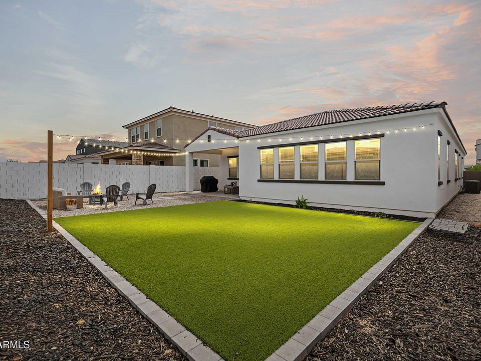 Relax in the primary suite with dual vanity sinks, large shower and spacious walk-in closet. Step outside to the covered patio and fully completed backyard, thoughtfully designed for low maintenance living without expensive upkeep.