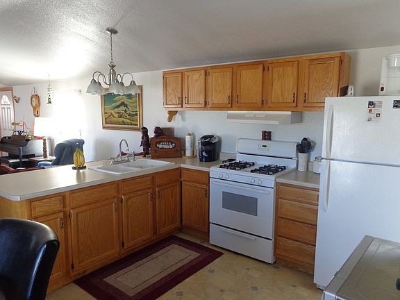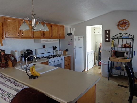 Cute home and affordable ! This home sites on a large lot with easy access. Covered patio that leads to the front living room room with high ceilings. Kitchen has open counter to living room. Nice cabinets with backsplash added for ease of care. Gas stove and refrigerator , washer & dryer to stay. Bookshelves stay. Some furniture available. Master bedroom has a walk in one piece shower, linen closet,nice vanity area. The second bedroom closet doors with mirrors and a shower & tub, nice vanity area & cabinets. Metal roof, home has had many updates to include painting & skirting around the perimeter. Nice colorful landscape when blossomed, circular drive. Water regulator installed.