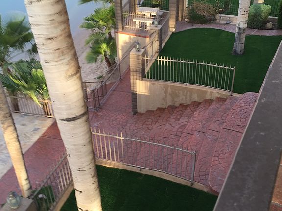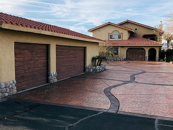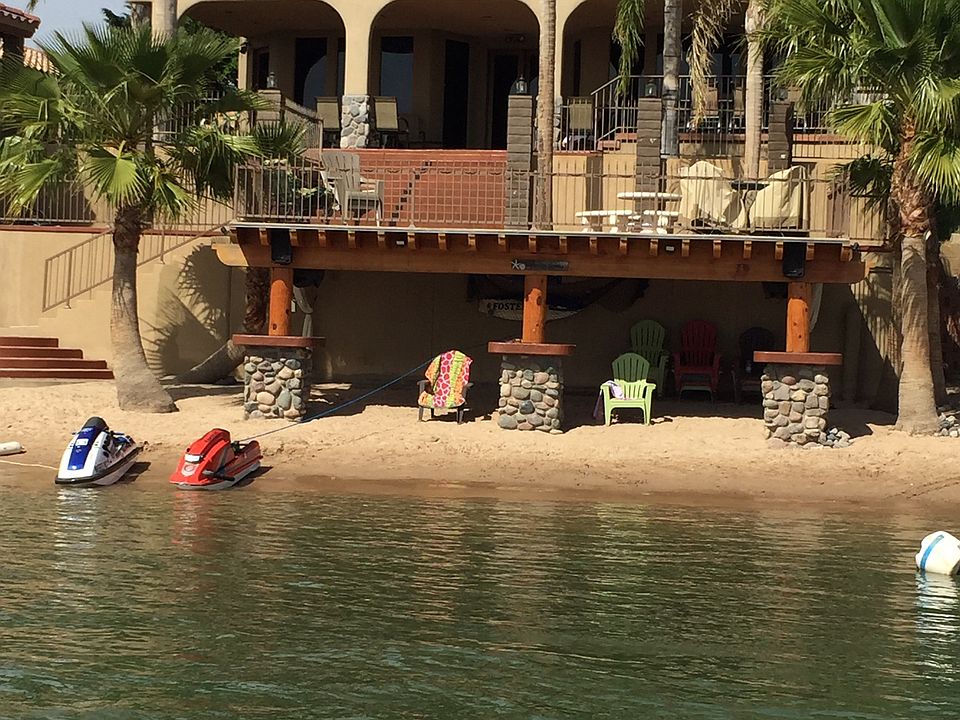 Sand between the toes and sun filled days are the memories you will make in this home of over 3000 sq feet. Long private drive with 3 car and 1 car garages with spacious areas for 2 RV's with hookups. Mature landscaping gives privacy to the front and back of the home. Rock exterior accents run through the home. Dramatic two story ceilings frame the views of the Colorado River which are taken in from all rooms on the main floor. Stone fireplace with water feature create a second focal point in the living room. Beautiful tile floors with marble accents, stained glass windows and art display alcoves create a restful sanctuary. Attention to detail shows in every aspect of the construction of this custom home. Wet bar complete with refrigerator and storage, seating with marble counters and backsplash create a perfect spot for cocktail time. Kitchen offers river views, granite counters, custom cabinets and breakfast bar. Both casual and formal dining with river views. Guests will be right at home as each bedroom includes their own bath.Graceful staircase with hand crafted banister wraps upward taking in the river view too. Landing offers great view of the river and living area. Master bedroom is large with the patio overlooking the lower patios, beach and river. Master bath is elegant with double sinks, jetted tub and large walk-in shower. Multiple outdoor patios, some with shade some in full sun create space for entertaining.Gazebo is a great lookout point. Beach area offers plenty of sand some shade and 3 TVs. Parcel is .53 of an acre with 61 feet on the Colorado River and 392 feet deep. Palm trees, citrus and tropical greenery make this the perfect retreat!Community is gated for additional privacy.