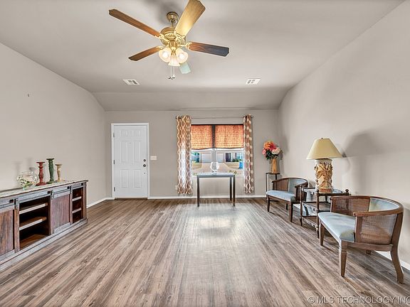 Impeccable newer one owner home in Broken Arrow. Popular split bedroom floor plan with high ceilings and pristine luxury vinyl plank floors throughout. Home features kitchen with a portable island and pantry, and quality cabinets with plenty of storage. Kitchen is open to the spacious living room along a counter lined with bar stools. The oversized master bedroom has an oversized walk-in closet as well, and the master bath features double sinks. Located on a quiet cul-de-sac, you can entertain in style on the covered back patio, without a neighbor behind you. Welcome Home!