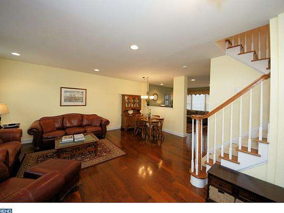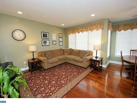 Spacious Brick-front Town Center 1600sqft Home, along with over 600sqft of finished basement, giving this home almost 2500sqft of finished space. This Town Center home offers open floor plan, with beautiful Brazilian hardwood floors throughout the first floor. Beautiful kitchen with upgraded Cherry Cabinetry and granite tops, designer back splash and stainless appliances overlooking living room is perfect for entertaining. 2nd Floor offers Master Suite with walk-in closet and luxurious bath with additional Cherry Cabinetry and a granite top with double sink, upgraded shower tile to ceiling. 2nd Bath with granite tops and upgraded Cherry cabinetry as well. Large basement offers over 600sqft of finished space, with Glass French doors separating the two finished areas. Short walk to banking, restaurants, shops and parks. Minutes to Interstate 95/295/195, as well as Hamilton and Princeton Junction Train Station.
