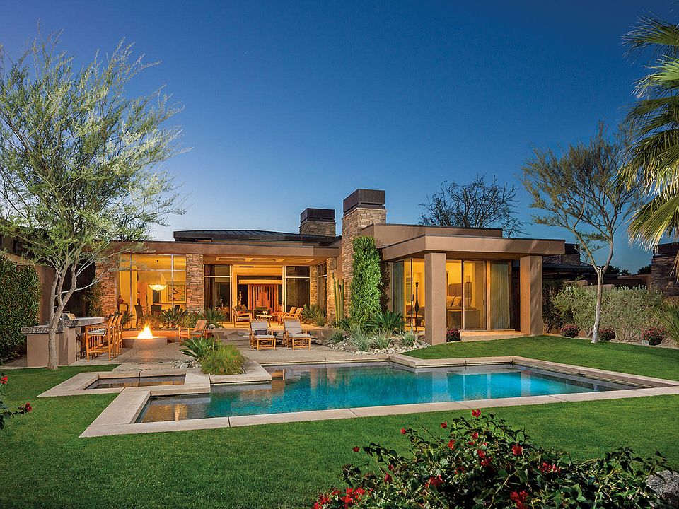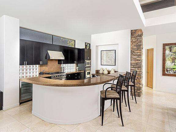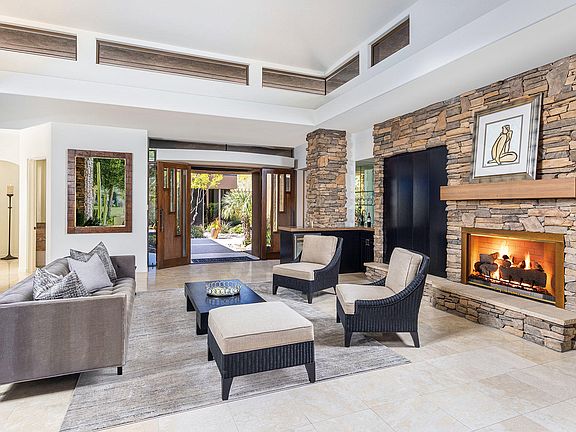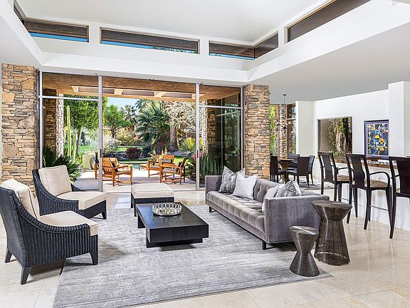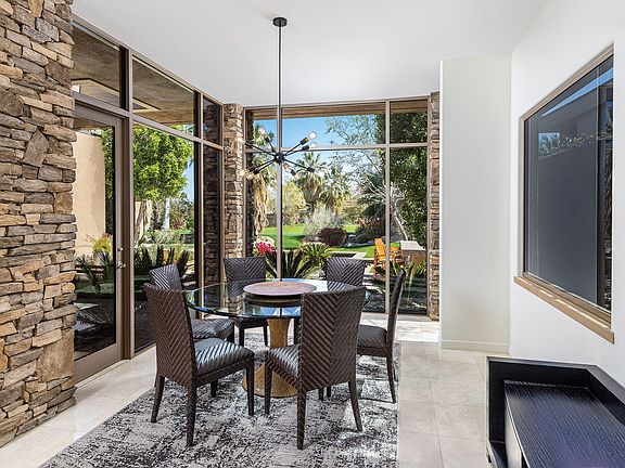 An idyllic setting with running stream, mountains and a private putting green in view from all of the living areas. This desert contemporary home offers seamless indoor-outdoor living. A spacious great room floor plan for casual living and entertaining which opens to the kitchen with an expansive morning bar, center island and high-end appliances. Spacious master suite with fireplace and glass sliders that open to the pool and spa. Two interior guest suites with full baths and glass sliders to entry courtyard. Also a private entry guest house with media center, morning bar, bath and walk-in closet. The covered outdoor living room with lounge seating is an extension of the indoor great room and is open to the patio with barbecue, dining bar, firepit, pool and spa.