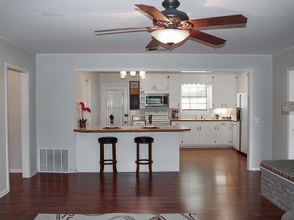 If you're looking for a separate workshop in your own backyard or maybe a 'man cave' or a 'she-shed' with power? Schedule to see this nostalgic 4 bd, 2 ba brick, one-story split plan featuring hardwood and vinyl plank flooring throughout. You will be welcomed at the relaxing front porch entrance via the entrance hallway to the family dining room with sliding door entrances onto the comfortable kitchen and big island bar- perfect for those celebrations. The island bar serves as a breakfast bar and the kitchen space is totally open to the great room with its cozy brick fireplace flanked by built-in-seating. Lots of windows throughout flood the large rooms with natural lighting. Four large bedrooms with bath access; well-designed built-ins and storage provided in quiet sleeping zones. Exterior amenities include a 2-car front entry car port, privacy fenced back yard including a delightfully party lighted and covered patio ready to celebrate your home coming to a warm and friendly established neighborhood. Welcome home!