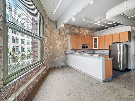 Spacious, 1-bedroom condominium spanning from the front to the back of the building! The Living Room features oversized windows overlooking Prospect Avenue. The Kitchen is equipped with stainless appliances, granite counter tops, and lots of cabinetry. This condo offers a very functional layout and privacy with the bedroom situated on the opposite end from your living area. The bathroom features neutral colors, modern hardware, and tub. You'll love this condo's high ceilings and character with its exposed brick and concrete floors. Full utility room with stackable washer/ dryer and sink (and extra storage!). The American Book Bindery has a workout room, secure access, elevator, and well-maintained common areas. Location, location, location! Walk to the Theatre District, Heinens, Progressive Field, and East Fourth Street.