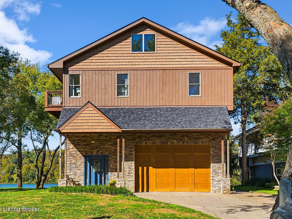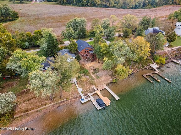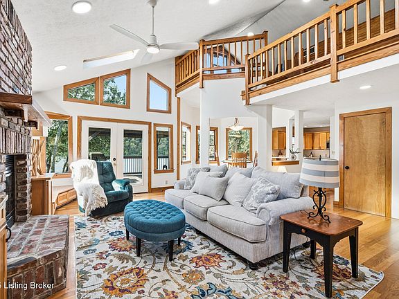 Enjoy sweeping river views and end each day with a sunset over the water. This stunning Ohio River home was designed for effortless living—whether you're entertaining on the full-width deck, relaxing by the fire-lit patio, or heading down to your private dock for a boat ride. Inside, an elevator carries you to the main living level with a vaulted great room, dining area perched for better views, and a bright kitchen with windows offering views of the ever-changing river and wildlife. The spacious primary suite feels like a private retreat, while the loft and lower-level offer plenty of flexible space. The lower level has enormous space to entertain guests with a projection TV, built-in Bourbon barrel wet bar, a full bath and flex space for a bedroom, office or hobbies. With low-maintenance materials, extra parking, and elevated construction above the floodplain, this home pairs riverfront beauty with peace of mind.
